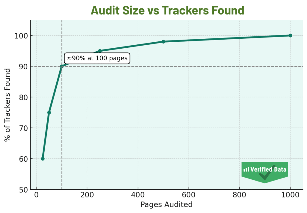 - 100 pages: Sufficient to uncover 90% of all cookies and trackers on most websites.