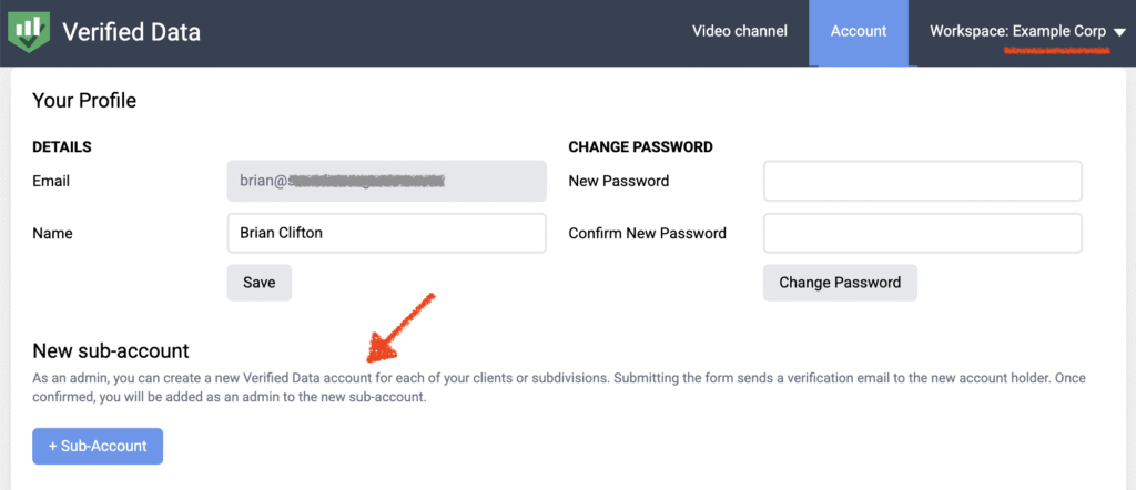 A Verified Data account is owned by an organisation. Create one for your company, then add your colleagues for access. Both agency and enterprise organisations can create multiple accounts and link them together as Workspaces.